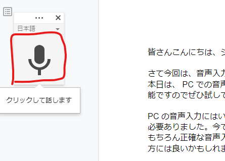 後はそのマイクのアイコンをクリックしてしゃべるだけ!スマホの時のように記号や空白は音声で入力できませんがかなりの精度で入力することができますよ!