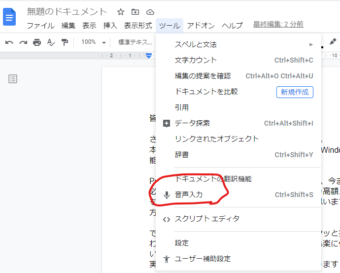 「ツール→音声入力」の順番でクリック。するとマイクのアイコンが表示されます。