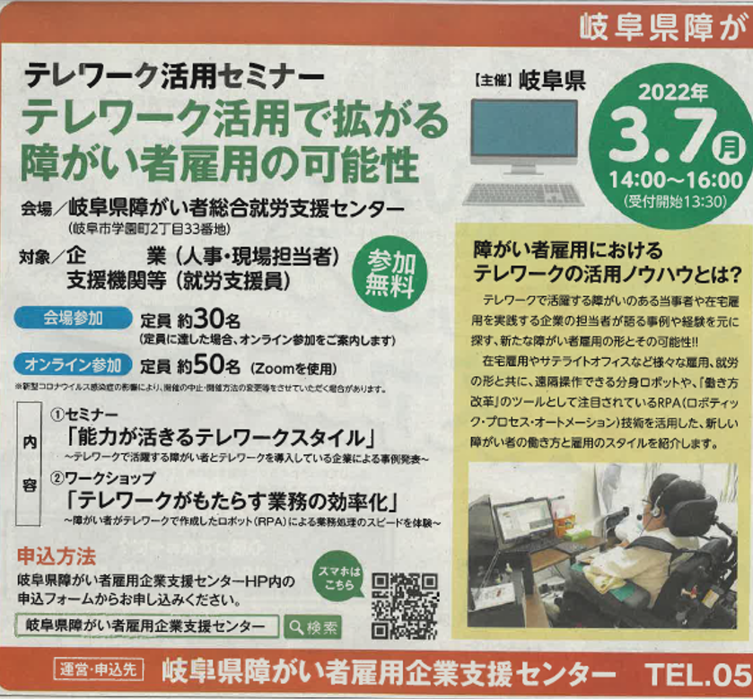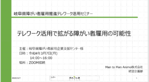 今回は企業支援センターが主催するテレワーク活用セミナーにて、「テレワークで拡がる障がい者雇用の可能性」というテーマでお話しさせていただきます。